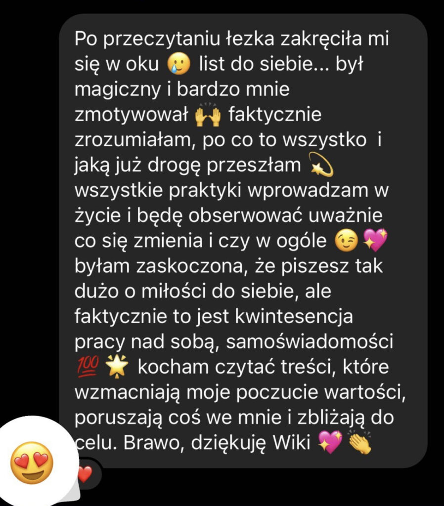 Przeszłam przez ten proces, by móc pomagać innym, tak jak robię to dziś. Dziękuję samej sobie, że wytrwałam i dziś żyję lepiej niż mogłabym sobie kiedykolwiek wyobrazić